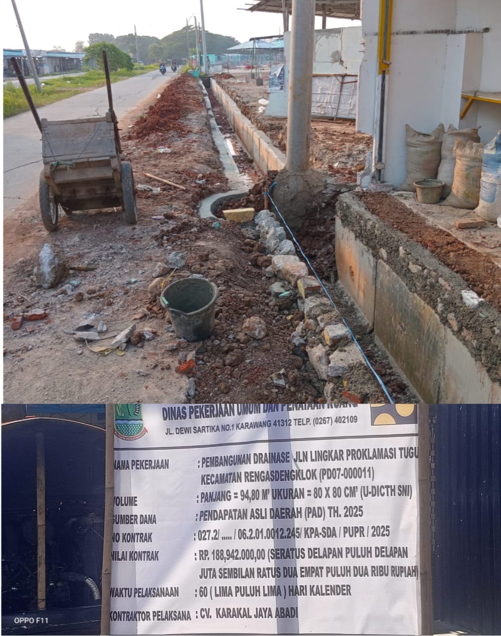 Proyek bernama Pembangunan Drainase Jln Lingkar Proklamasi Tugu Kecamatan Rengasdengklok (PD07-000011) ini memiliki panjang 94,80 meter dengan ukuran saluran 80×80 cm (U-Ditch SNI). Proyek bersumber dari Pendapatan Asli Daerah (PAD) Tahun 2025, dengan nilai kontrak sebesar Rp188.942.000,00 dan masa pelaksanaan 60 hari kalender.