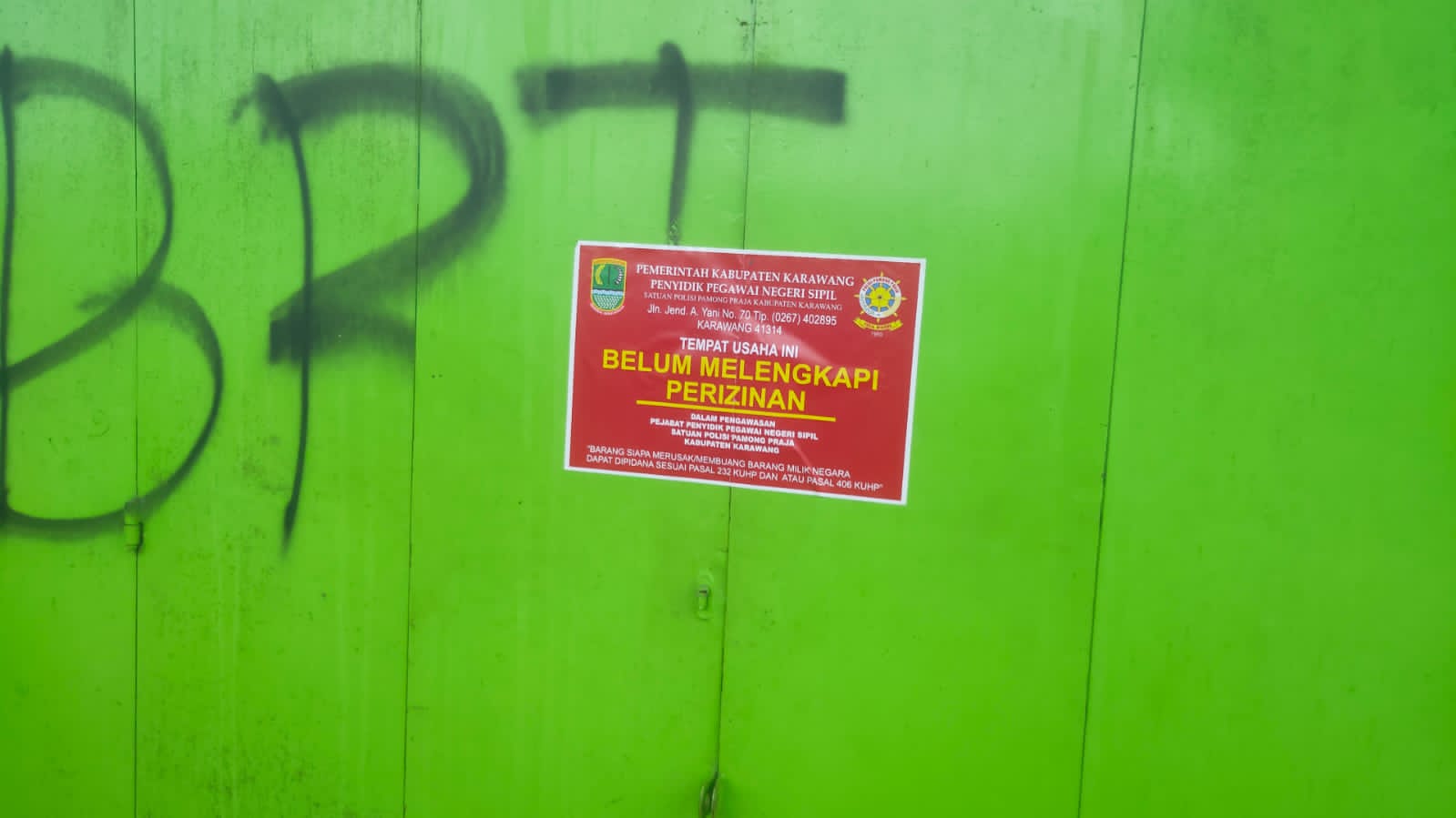 “TEMPAT USAHA INI BELUM MELENGKAPI PERIJINAN. DALAM PENGAWASAN PEGAWAI NEGERI SIPIL SATUAN PAMONG PRAJA KABUPATEN KARAWANG. BARANG SIAPA MERUSAK/MEMBUANG BARANG MILIK NEGARA DAPAT DIPIDANA SESUAI PASAL 232 KUHP DAN/ATAU PASAL 406 KUHP.”