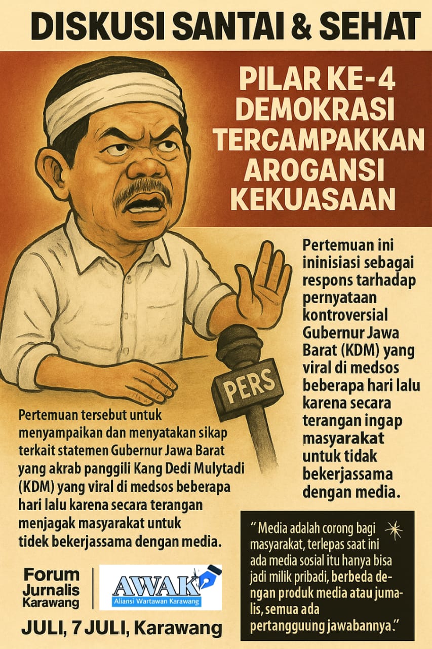 Karawang, Lintaskarawang.com – Pernyataan Gubernur Jawa Barat, Kang Dedi Mulyadi (KDM), yang viral di media sosial karena secara terang-terangan mengajak masyarakat untuk tidak bekerjasama dengan media, menuai kecaman dari berbagai pihak, khususnya kalangan pers.