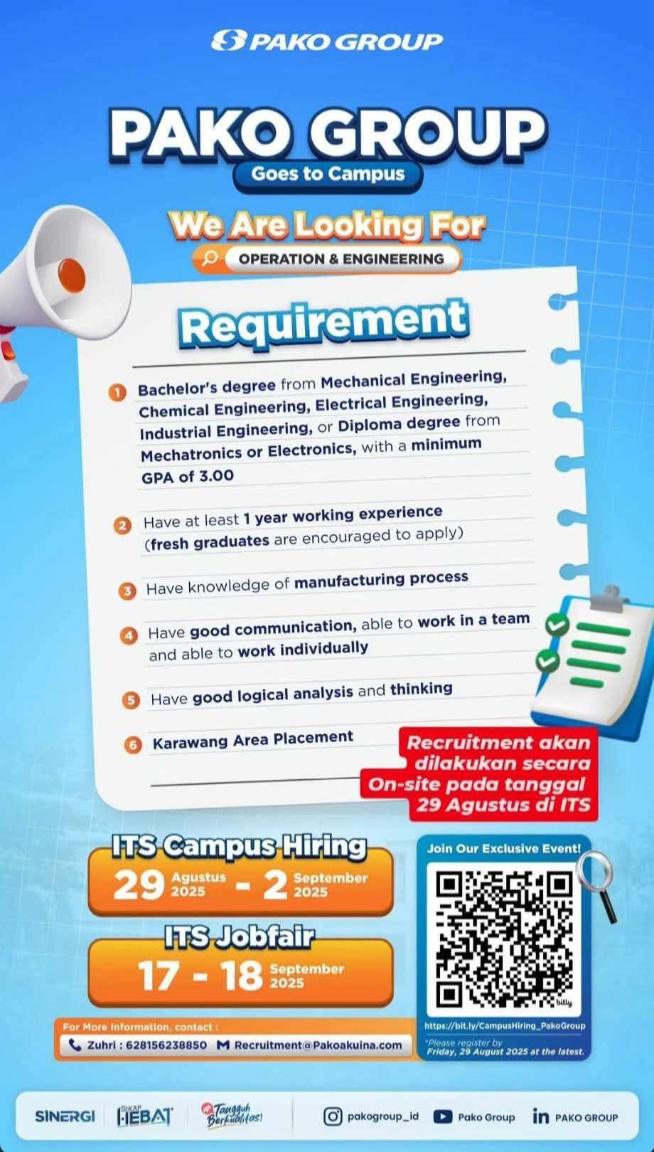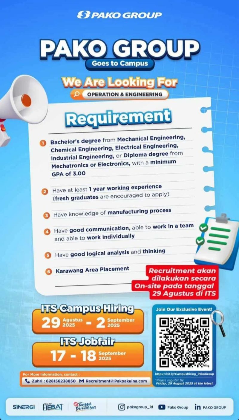 Karawang, Lintaskarawang.com – Fenomena rekrutmen tenaga kerja yang dilakukan di luar wilayah Karawang kembali terjadi bahkan kali ini menjalar ke lembaga pendidikan tinggi. PT Pako Group, perusahaan komponen otomotif, membuka lowongan kerja Operation & Engineering dengan penempatan di Karawang. Namun proses seleksinya justru dilaksanakan di Institut Teknologi Sepuluh Nopember (ITS), Surabaya, pada rentang 29 Agustus–2 September 2025, dan dalam rangkaian ITS Jobfair pada 17–18 September 2025.