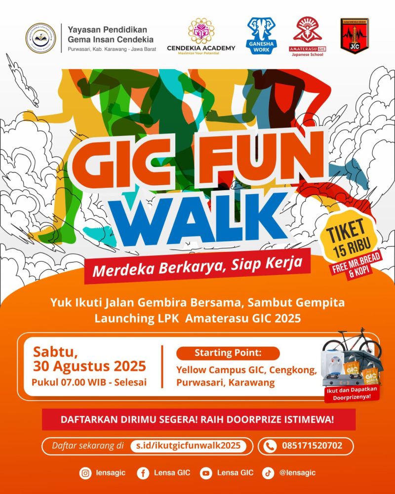 Karawang, Lintaskarawang.com – Yayasan Pendidikan Gema Insan Cendekia (GIC) sukses menggelar acara GIC Fun Walk 2025 pada Sabtu (30/08) di Yellow Campus GIC, Cengkong, Purwasari, Karawang. Kegiatan ini berlangsung meriah dengan mengusung tema “Merdeka Berkarya, Siap Kerja”.