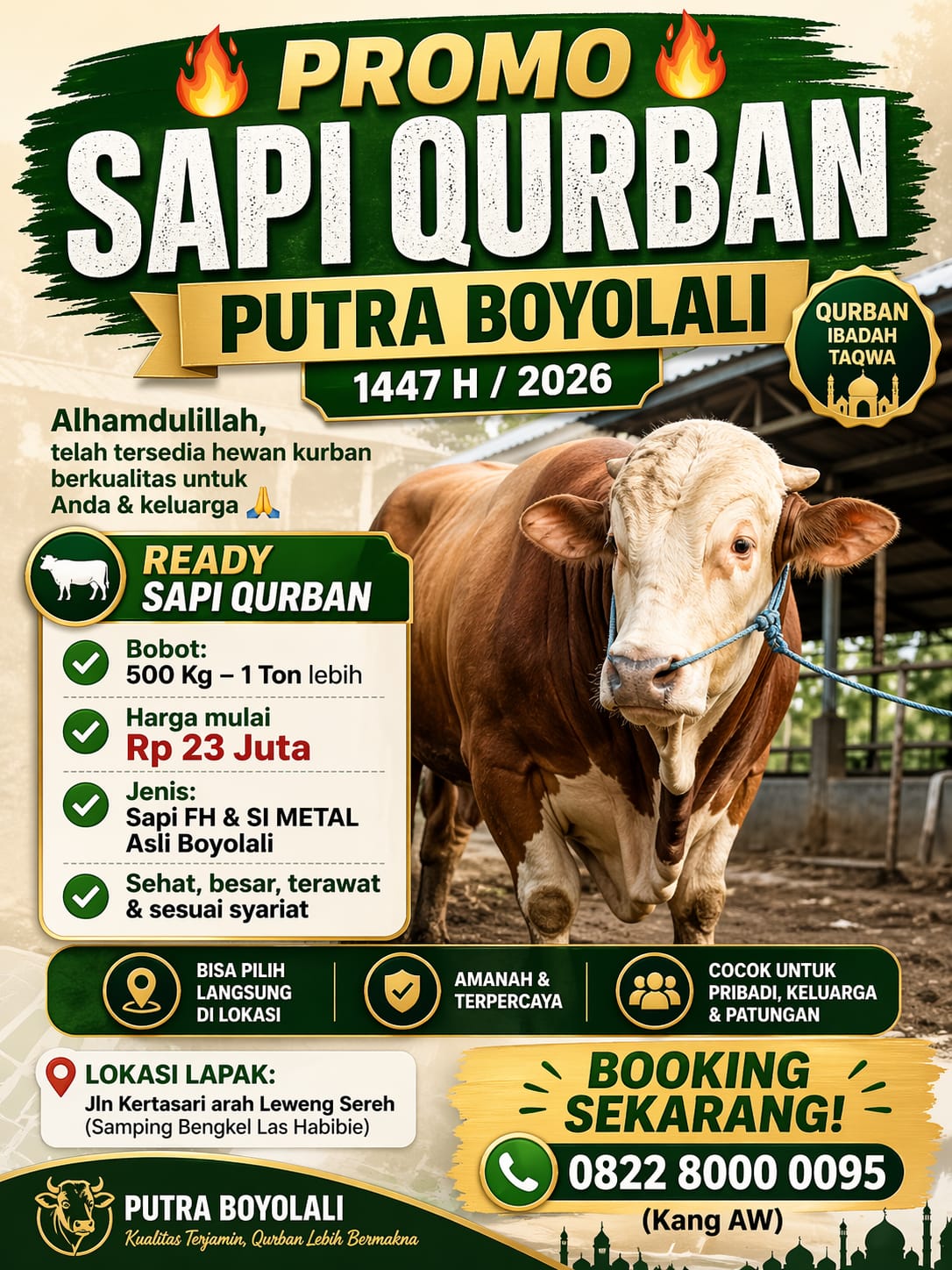 Jangan lewatkan kesempatan mendapatkan sapi kurban terbaik dengan kualitas terjamin, pastikan ibadah kurban Anda tahun ini lebih tenang, berkah, dan maksimal bersama Putra Boyolali.